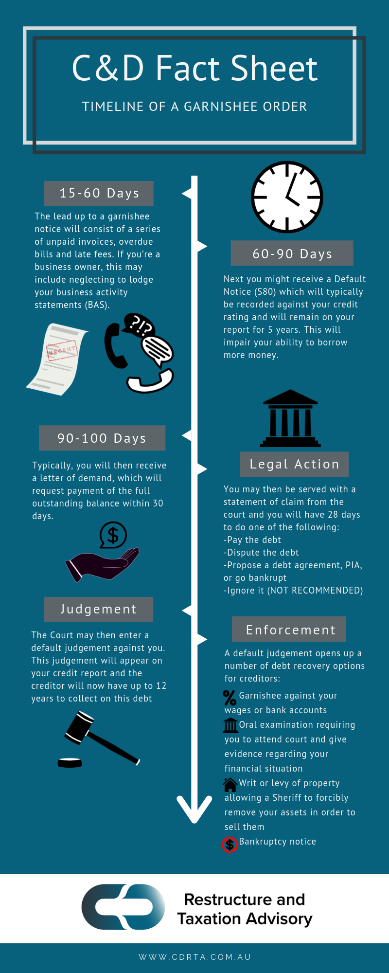 If you’ve received a garnishee notice or believe there may be one on the horizon, you can schedule a free consultation with CDRTA to discuss your options and take action before it’s too late.